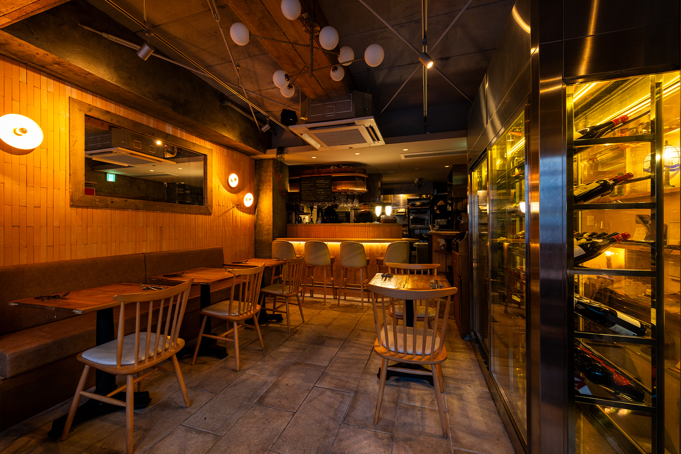 墨田区に佇むビルの階段を上がると、壁に埋め込まれたワインセラーがお出迎え。店内へ一歩足を踏み入れると、お洒落なビストロのような空間が広がります。